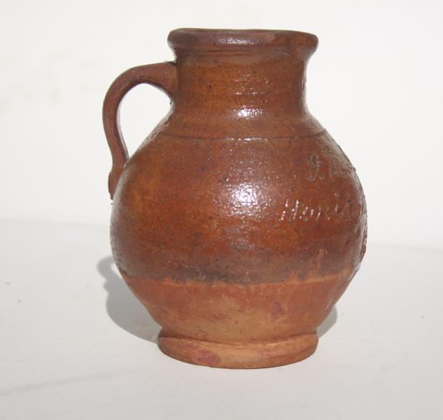 small jug, of the form produced in Devon at Honiton from the 17th to the late 19th century. This inscribed J.M.Jenkins , Honiton pottery 1869.