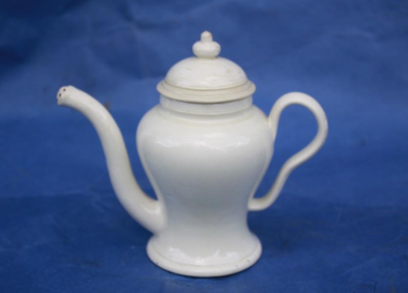 A rare late 18th century creamware child's feeder. Of inverted baluster form. The slender curved spout with pierced end and ear shaped handle.