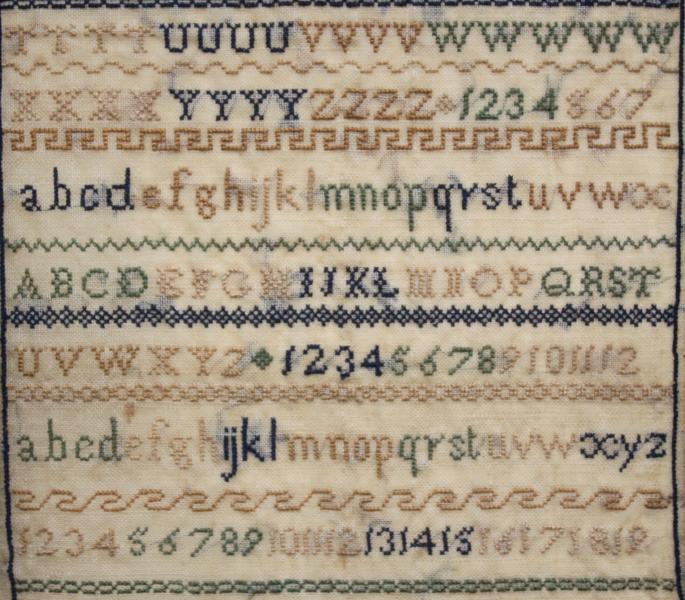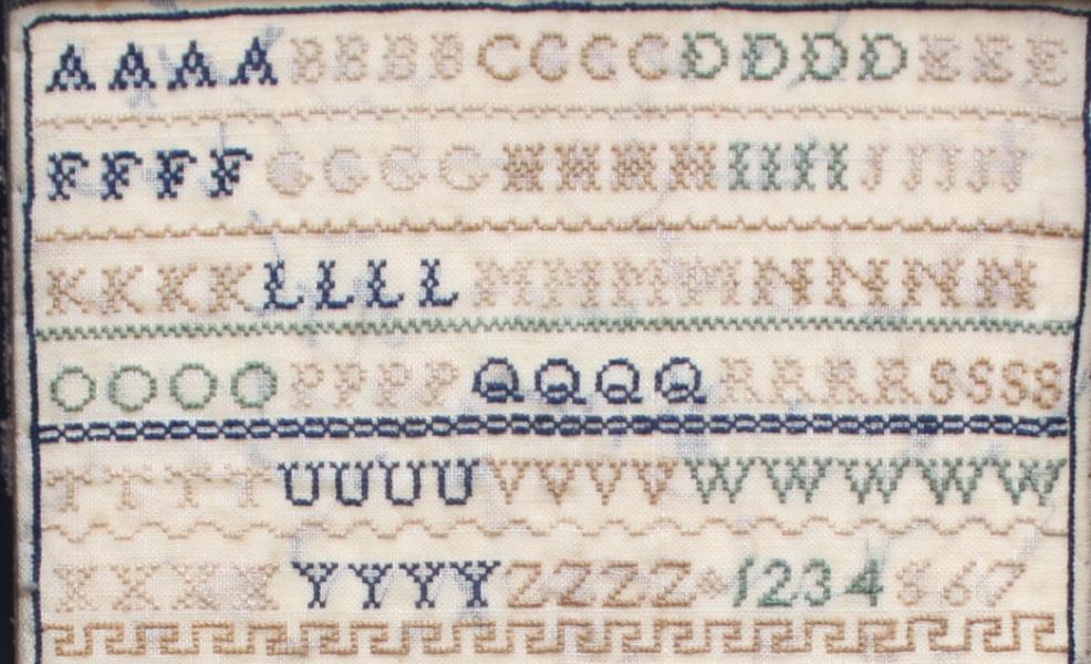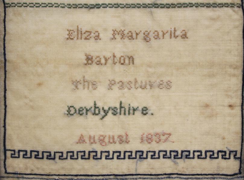 It can be said that often the most interesting girls, produced visually the least interesting samplers. Take Eliza Margarita Barton. Daughter of Eliza Georgina Hawkins and James Barton was born in Matoonga, Bombay India (Sep.1825). It would appear she was sent to School back in England at The Pastures in Derbyshire where she worked her sampler, possibly because her father had died in 1829. Anyway she returned to India and married Captain James Arnold Heathcote in 1858 aged 33, a retired commander in the Indian Navy. Shortly after she again returned to England first to Hackney before renting the RED HOUSE, the most significant Arts and Crafts private family house built by the designer William Morris, completed in 1860. She died in 1916 aged 91. |