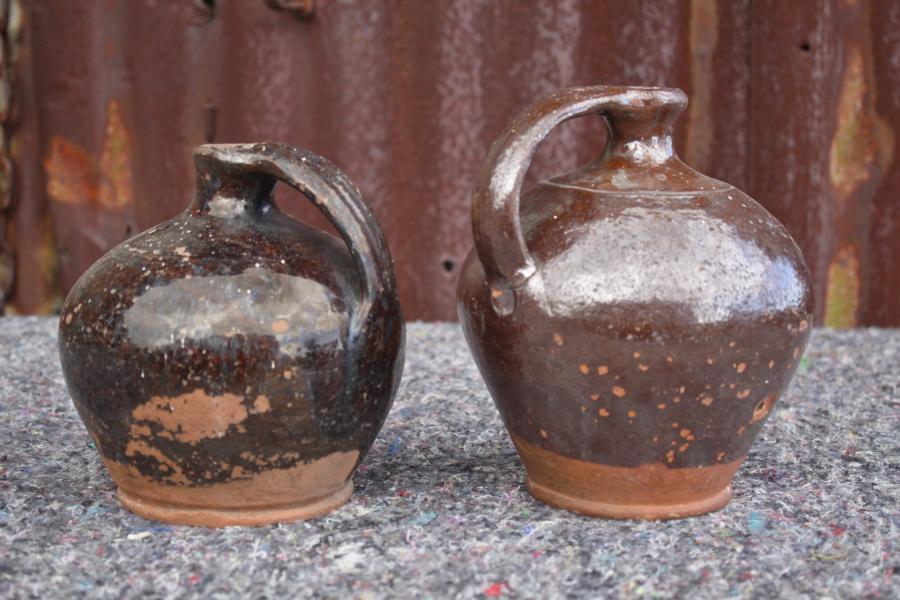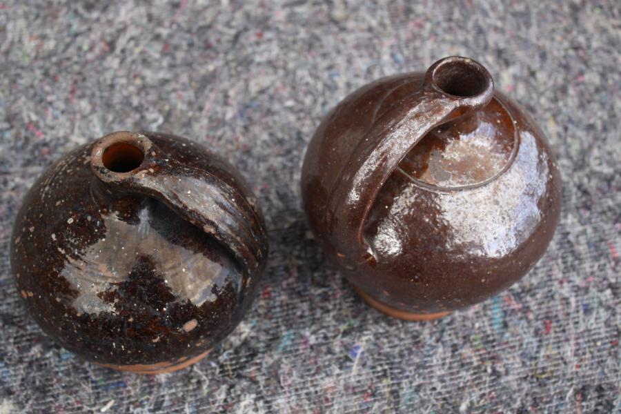 Two harvest flasks that were acquired together some time ago by a collector and brought by us yesterday one the one on the left probably early 19th the other late 19th century and displaying a slight change in form . Both from the same area, Possibly Wiltshire Wiltshire. |