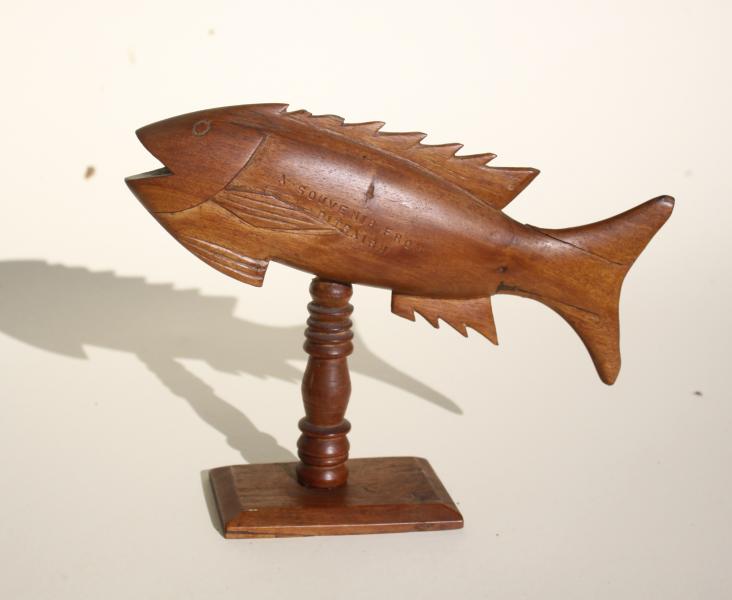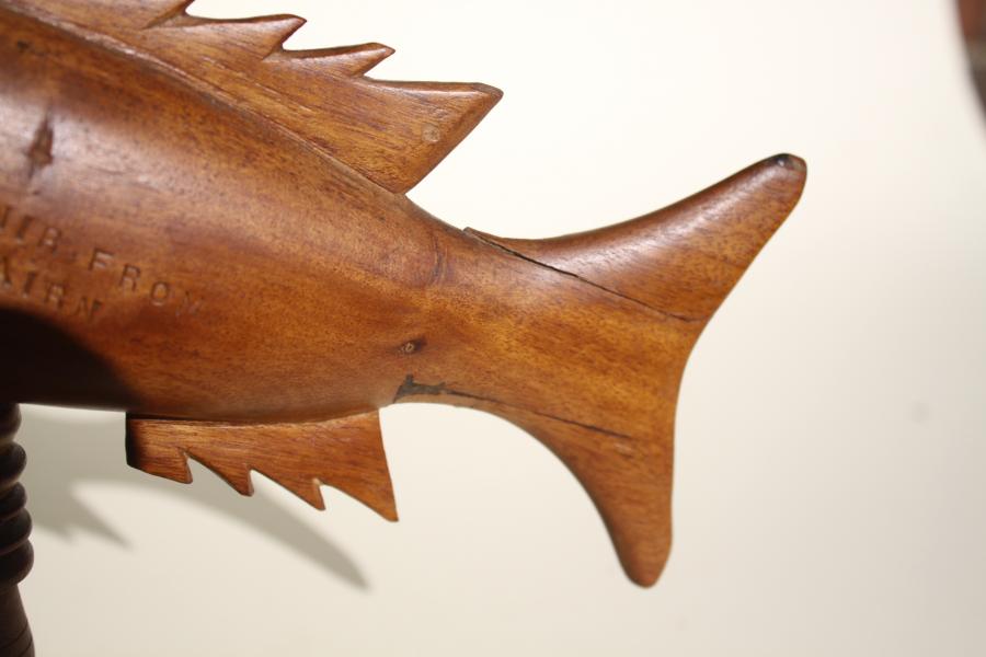Good condition for an antique hand carved wood item. Note old repair to tail fins and what may be damage to first two top spikes of upper fin..