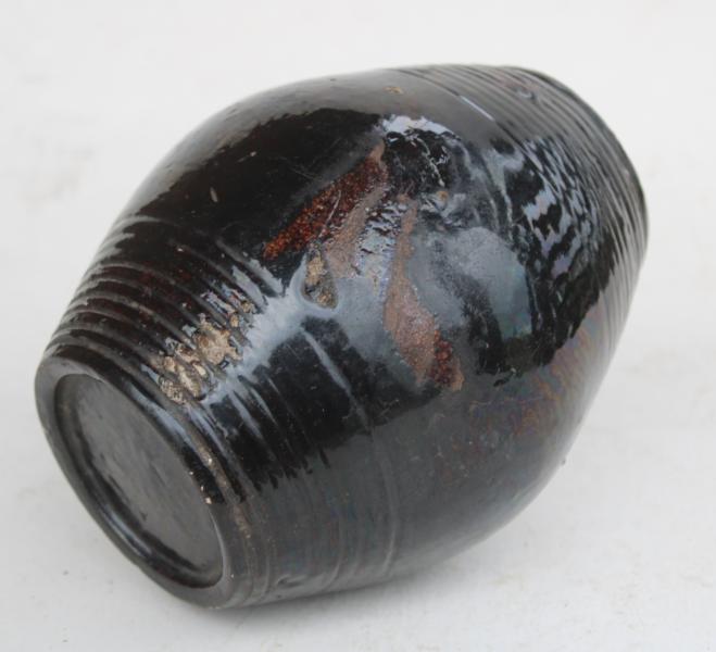 Wonderful deep brown almost Black glaze of this costrel barrel makes it stand out .