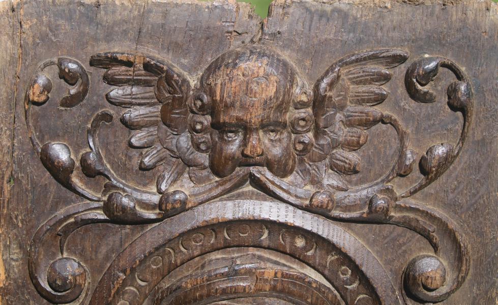 An unusual mid 16th century Romayne panel depicting a central roundel with a portrait of a gentleman in contempory dress hat. Above this an Angel is flying.
