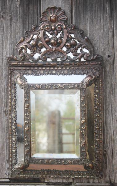 17th Century in style but 19th Century Dutch /French raised fielded mirror with pressed brass mounted surround. All the appearance of great age with deep unpolished color to the metal.