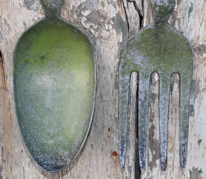 A wonderful oversize folk & spoon. Aluminium with wonderful green decoration.