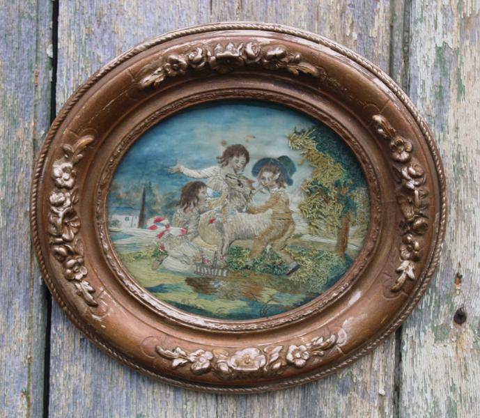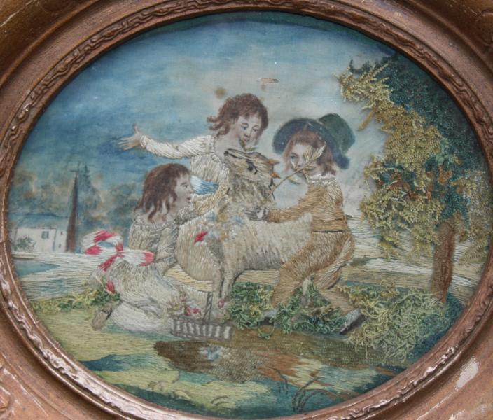 A charming early 19th century oval silk needlework depicting children with there pet lamb.