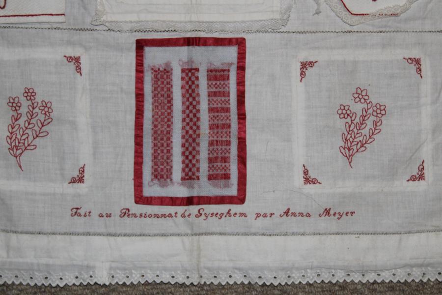 An interesting and unusual late 19th century School sampler by Anna Meyer , "Made at the Boarding School Gyseghem" .