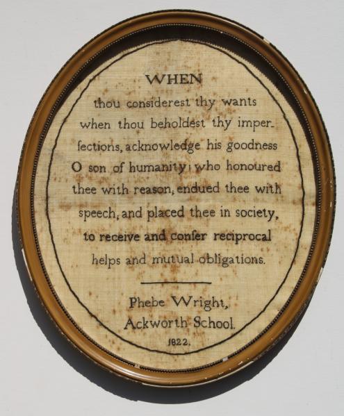 An oval extract sampler worked in monochrome by Phoebe Wright with text ''when thou considerest thy wants when thou beholdest thy imperfections, acknowledge his goodness O son of humanity, who honoured thee with reason, endured thee with speech , and placed thee in society , to receive and confer reciprocal helps and mutial obligations.''