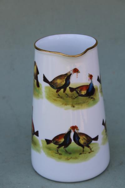 A rare and unusual jug depicting COCK FIGHTING SCENES features six polychrome images of a pair of cockerels fighting. Each image has a separate title and position: A Set, A Knock Down Blow, A Rally, Heeling, The Death. One of the titles is not clearly visible. The pitcher has gilt highlights around the rim, base, top and handle. A highly unusual item ideal for collectors of antique British pottery.