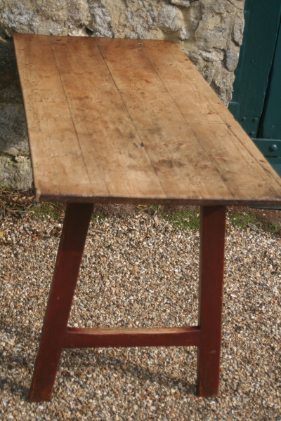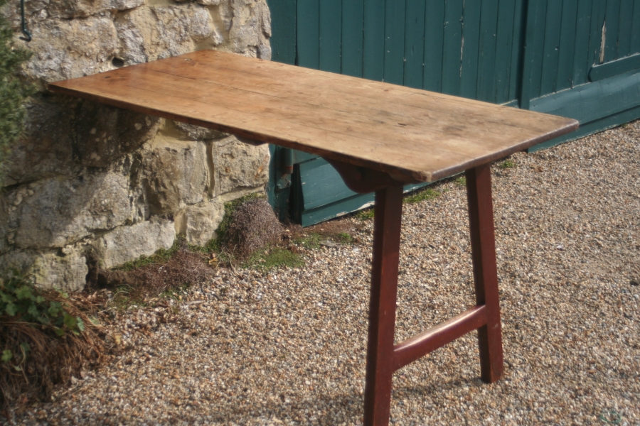 The three plank top, with original surface including knife marks (it would have been a work top) with traditional deep red-paint on the underside.