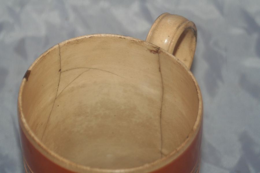 Although extensively damaged this slip decorated Mocha type mug has great appeal. The deep almost orange colour is unusual and very striking, as is the dramatic effect with the two diced engine turned bands . The handle has simple folate terminals.It is produced in creamware rather than a pearlware earthenware so probably dates to the 1790s. Height 6 inch, 5.3cm. Diameter 4 inch, 10cm Condition. Grubby, Large crack runs down the side of the handle to the base and then joins another that runs partly around the footrim. Some staining on the base. Another crack runs down the side, branches into two . Total lengths 3 1/2 & 2 inch. There is a crack between the branches. Small chip on rim , another in the crack on the footrim. |