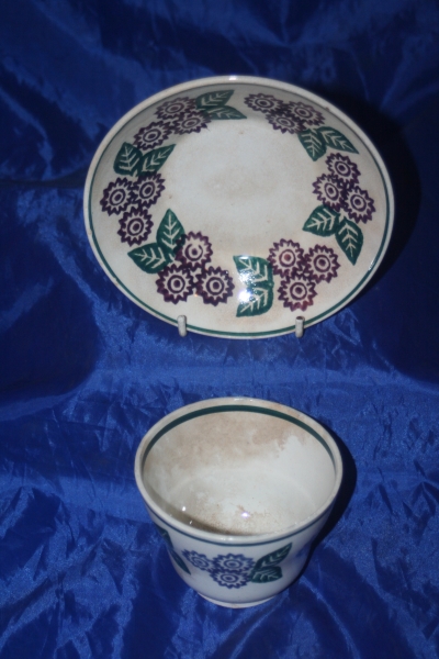 The pattern produced by cut sponges in two colours, mauve and green 5 times on the cup and six times on the saucer is framed by matching green lines.