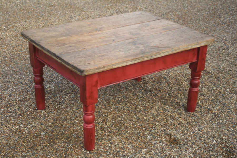 Here we have a 19th Century pine kitchen table with old scrubbed top of great colour. The base and legs painted in barn red over a light blue.