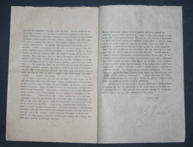 It is an explanation of Leaches acceptance of the Baha\'i faith and is signed by Leach at the end of the text in pencil, and so has very much the feeling of aprinted letter.