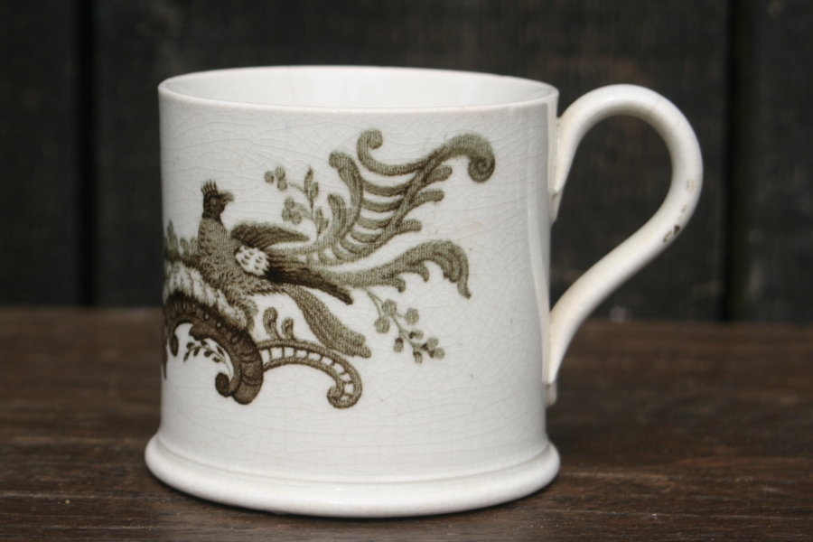 An early childs mug, transfer printed with a floral pattern including a birds that frame the central name ANN.
