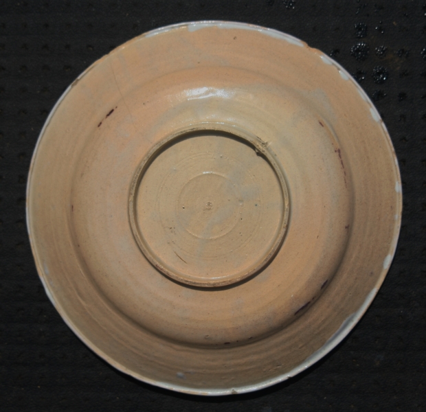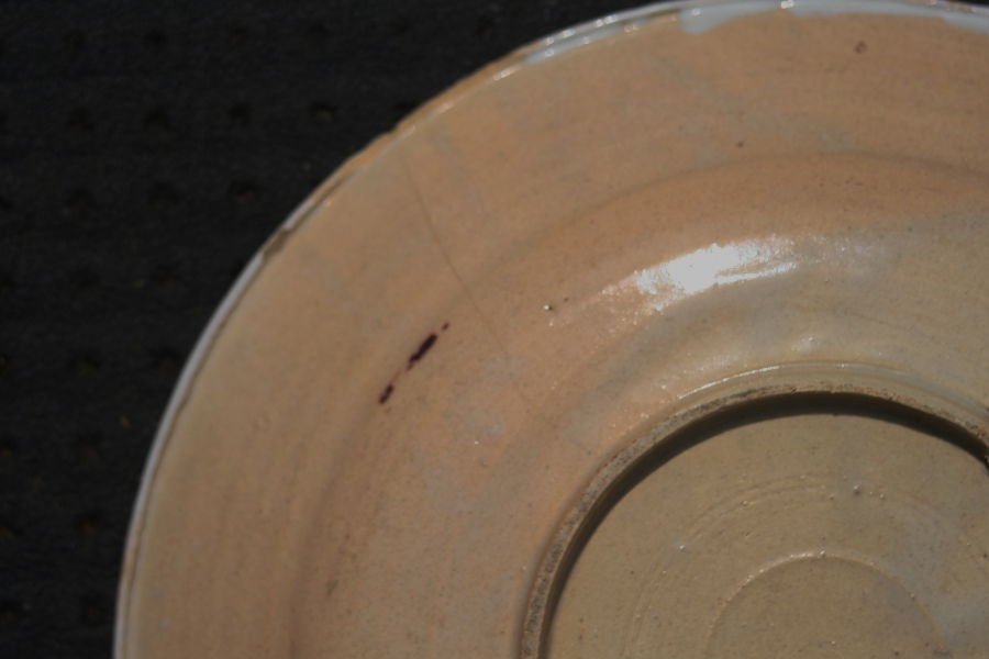 Condition two small rim chips there is also a hairline crack at 9 o'clock that travels towards the centre. Some minor ware to glaze -scratches etc. from use and consistent with age.