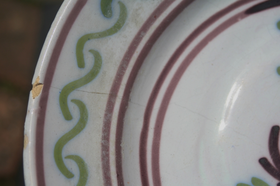 An interesting delft charger decorated in manganese and green . The front glazed in a tin glaze the back lead glazed as one would expect on very Early Delft plates of both England and the low countries and the shape again is typical of dishes of circa 1700. But I have found no comparable example with these colours or pattern.