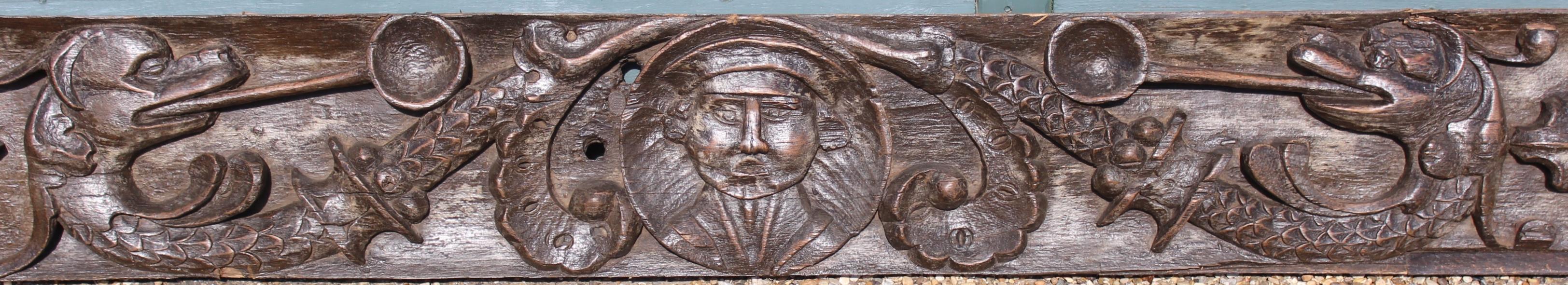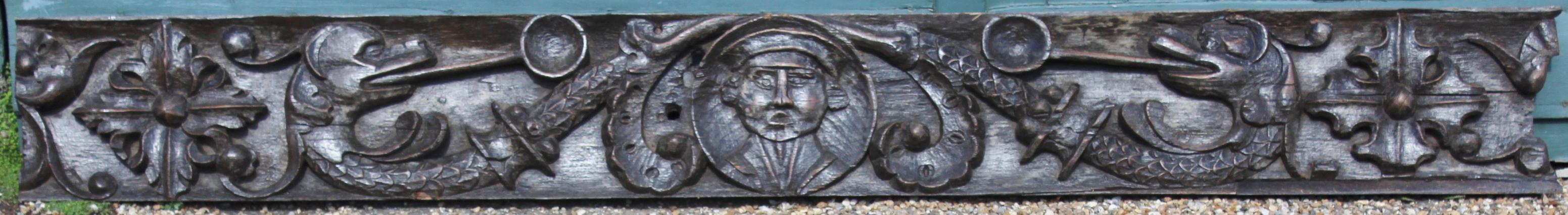 An incredible find, reused as part of a late 19th century day bed, is this carved beam, cut down so only the front remains, and unfortunately cut up in lengths, but the important central portion is good.
