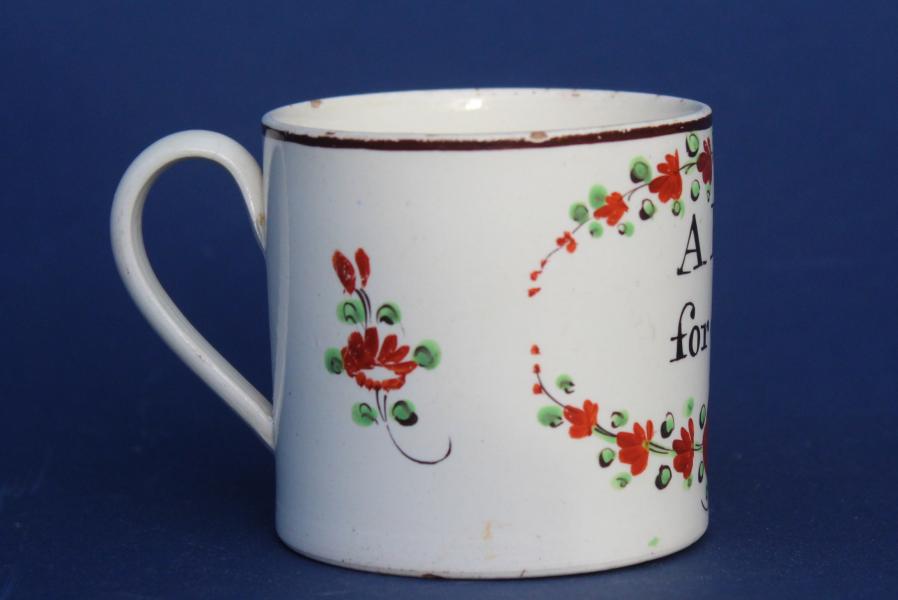 A great late 18th century creamware child's mug. Probably Yorkshire, Leeds area.