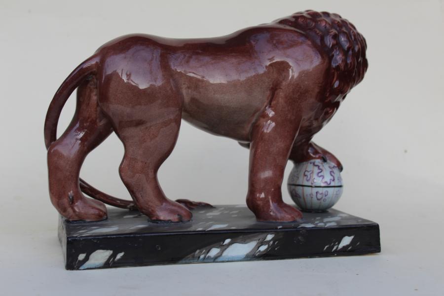 A wonderful and rare late 18th or very early 19th Century pearlware figure of a lion. Probably Staffordshire. His front paw on a globe although interestingly the islands illustrated do not conform to the earth. The whole on a fo-marble base. I must say the painted detail on this is as good as any thing I have seen in Staffordshire figures.