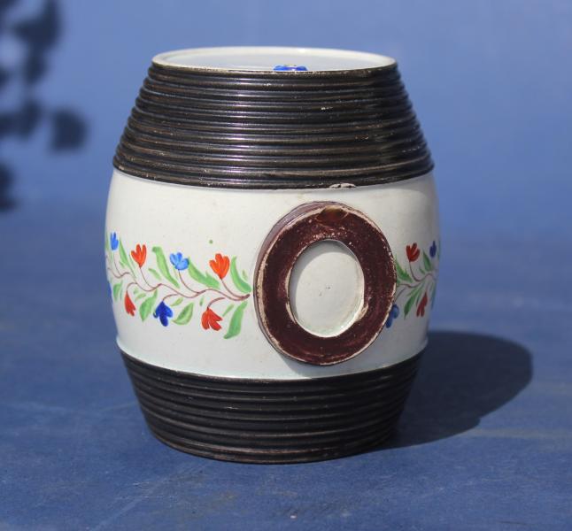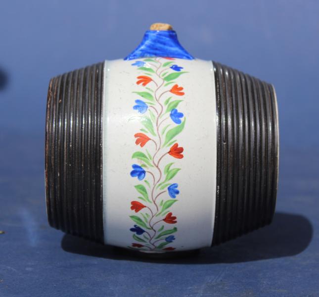 There was a great tradition of producing small pearlware spirit barrels in Bristol at the beginning of the 19th Century. Often highly decorated in bright colours. This I feel is in the same tradition but a little different in that it is a true copy of a barrel with both a moulded plug at the base as well as the corked opening at the very top. It also has what I have never seen before is a moulded ring to the bottom so it stands well. The middle painted with a band of small flower heads in over glaze colours.