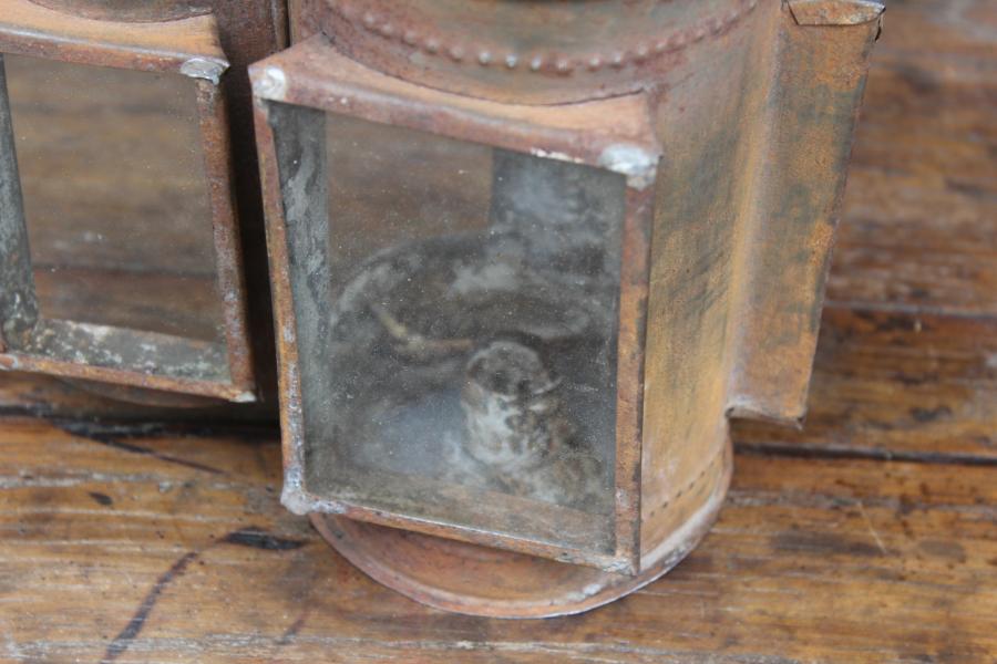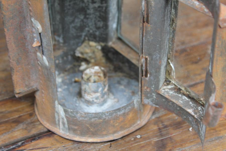A mid 19th Century Tin / sheet iron candle lantern with three windows, pierced conical top and carrying loop handle.