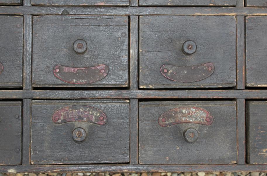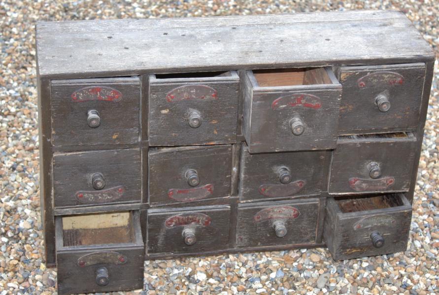A wonderful small set of 12 draws retaining there original tin labels and painted surface.