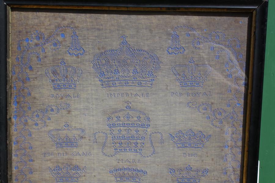 We have never seen a sampler like this exceptional whitework. Signed AH and dated 1857 it is inscribed FABRIQUE DE BONNETERIE DE PARIS, SOUTFORT, RUE DE LA MONNAIE No.9 (PARIS HOSIERY FACTORY, SOUTFORT, RUE DE LA MONNAIE).