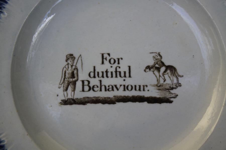 A wonderful early pearlware plate with blue feather edge. Transfer printed to the center with "FOR DUTIFUL BEHAVIOUR" for performing the duties expected or required of one ! I'm not sure that this required a reward , a bit like tipping your hair dresser for doing a good job, or the taxi driver for driving you to your destination safely !. |