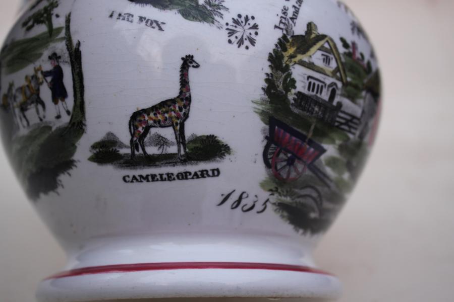 An interesting dated (1835) jug, Although the named animals are recorded earlier on pots circa 1820 it is an early date for the three round prints CORNFIELD, FARMYARD & SUMMER AND I'm surprised that they were still calling a Giraffe a Cameleopard at this date. Obviously copying an old print. Probably made in the North East.