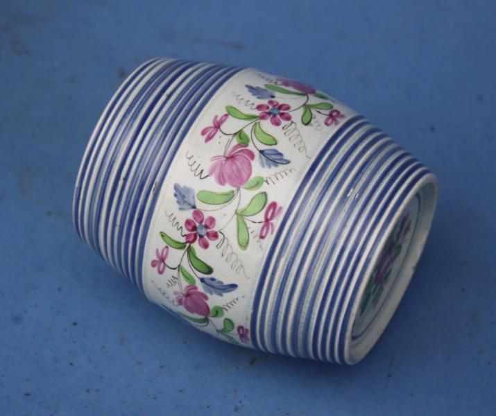 A very rare and unusual Bristol Barrel decorated in a blue pallet with a typical band of flowers again in an unusual colour combination.