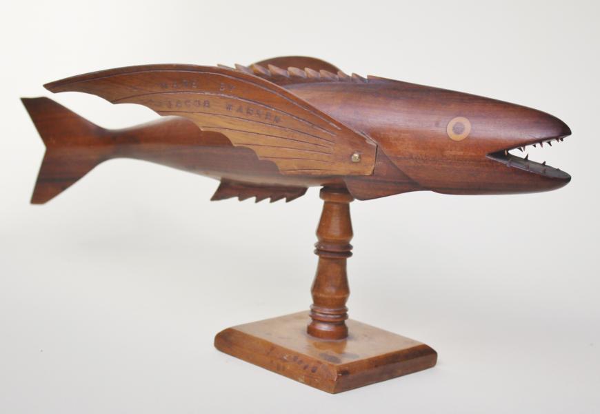 A lovely classic carved fish by JACOB WARREN signed on one wing, the other with full inscription Souvenir from Pitcairn Island home of the mutineers of HMS Bounty landed Jan 23 1790.Length 15 inches 38 cm
