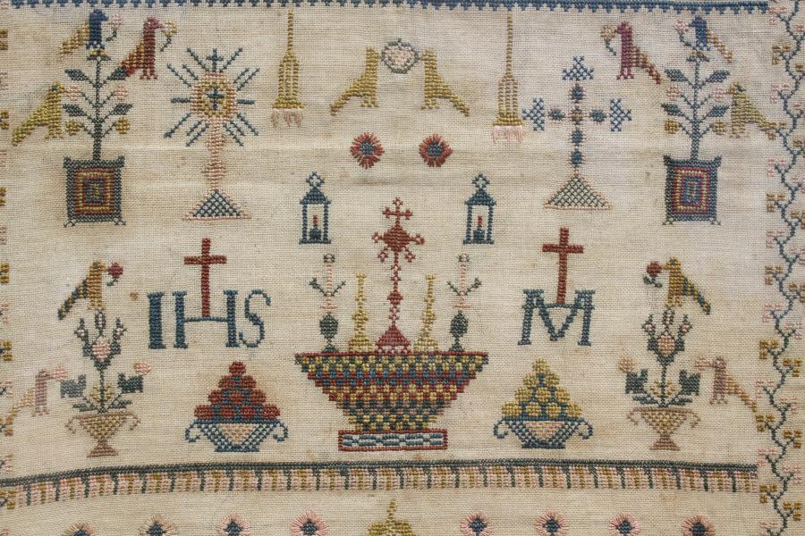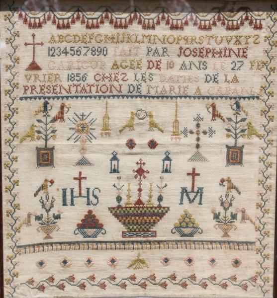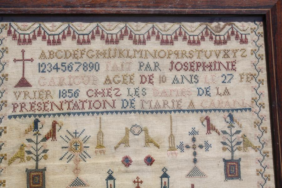In our experience , it is uncommon to find continental samplers with the details of the sewer, school and date on them , so we were delighted to find this French example, inscribed... MADE BY JOSEPHINE GARIGUE 10 YEARS AGE ON 27 FEBUARY 1856 AT THE LADIES OF THE PRESENTATION OF MARIE A CABANN. (in French).