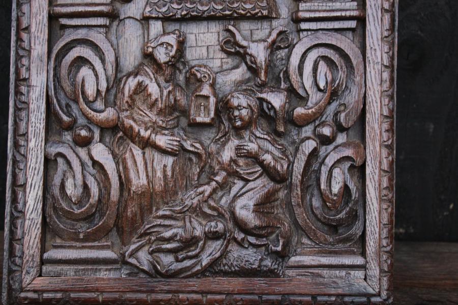 Flemish Nativity panel circa 1600, interesting Grotesque head amoungst the clouds , love the lantern.