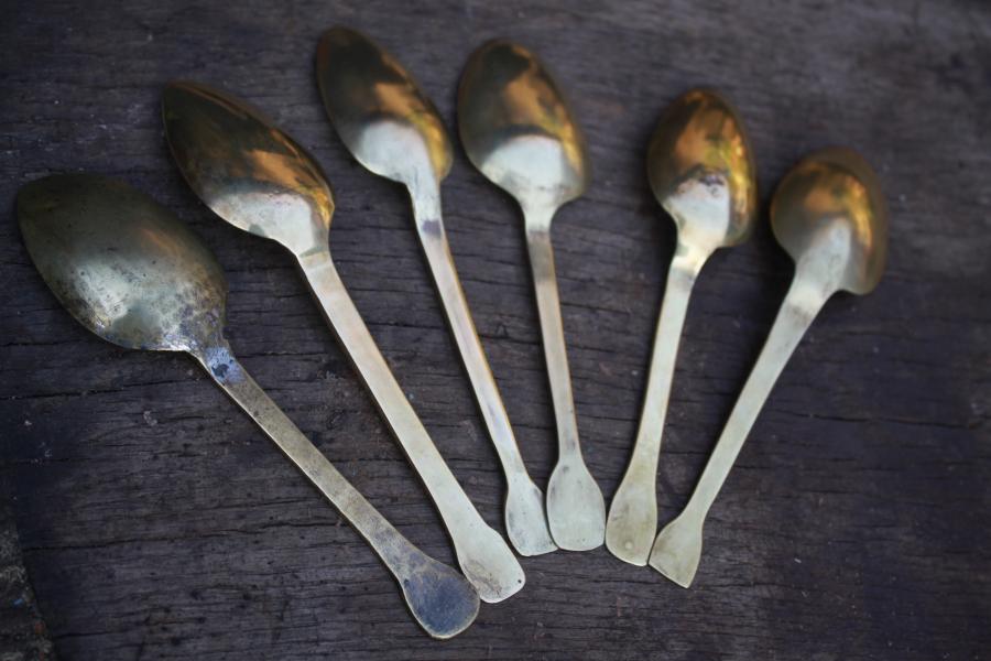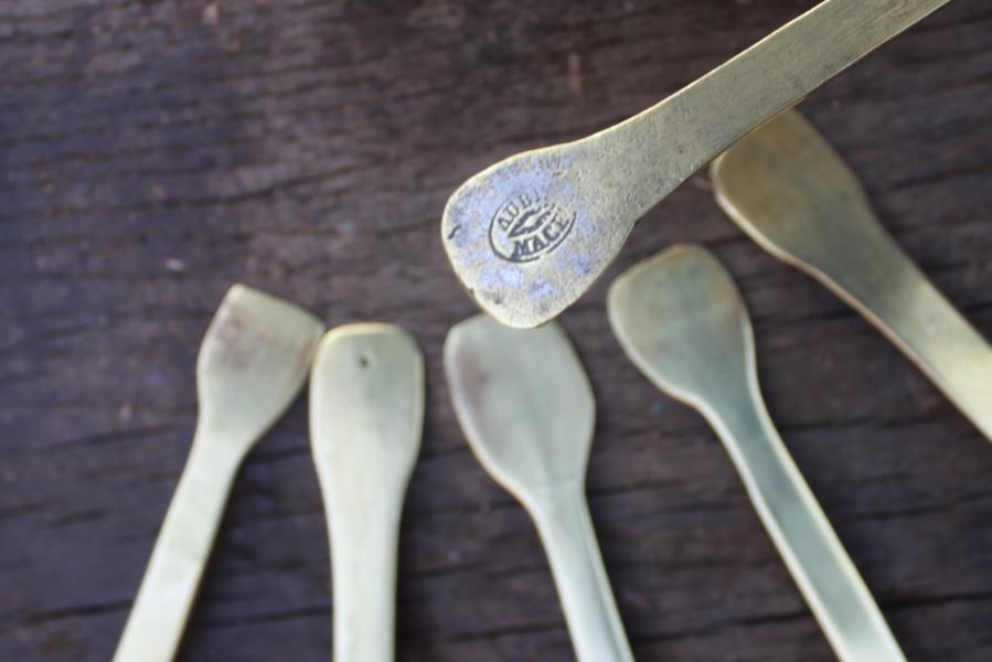 Not born with a silver spoon, then brass will have to do !. A matched set of six 18th / early 19th century French Breton Spoons, one with makers mark,