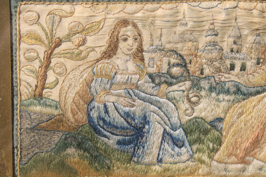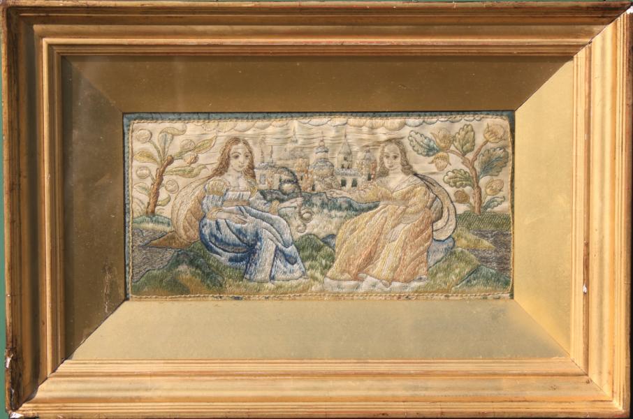 A delightful and charming 17th century silk panel, depicting two female figures one holding a snake the other a bird. Possibly representing good & evil. Probably originally from casket or box.