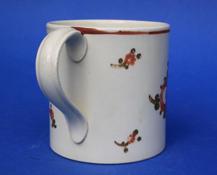 A SUNDERLAND CREAMWARE MUG ATTRIBUTED TO PHILLIPS' NORTH HYLTON POTTERY, DATED 1826 with red and overglaze painted stylised floral decoration and inscribed in black Thomas Meek son of Michael & Mary Meek born Octr 25 1826, 10cm.