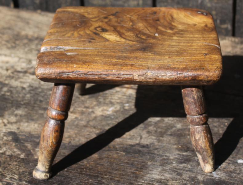 What makes a perfect stool, character ! this one stands straight but look at those legs, three short and one long, with a great piece of wood on top.