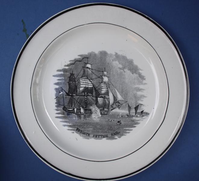 A group of three patterns depicting sailing ships by an unknown maker. Each central scene is titled at its base and is printed with simple black-lining on the rims of plates. All recorded examples are unmarked and the only colour known is black, although a few examples have the design highlighted in colour.