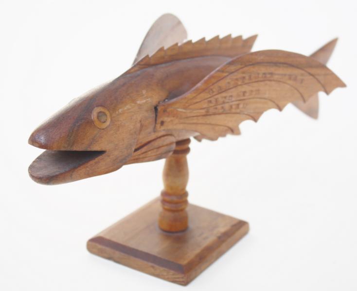 A "standard" fish by this uncommon maker. Typical form with inlayed eyes and applied wings. signed "Greetings from Pitcairn Island Bert Christian.Length33 cm.