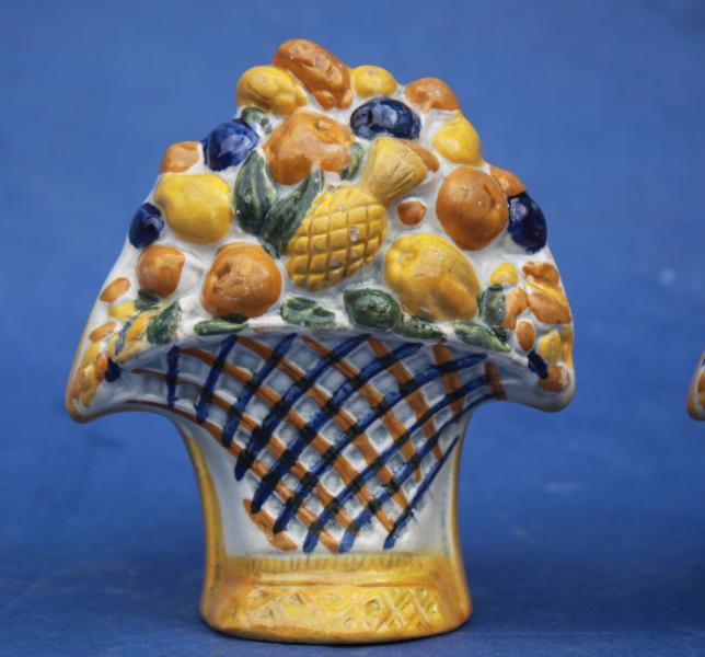 A wonderful pair of early 19th century Staffordshire Window stops. Formed as urns of summer fruits and decorated in pratt colours.