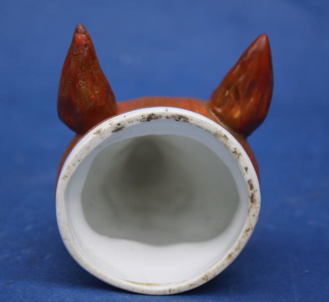 A good Staffordshire porcelain Fox Head stirrup cup, decorated in naturalistic colours in over gaze enamels.