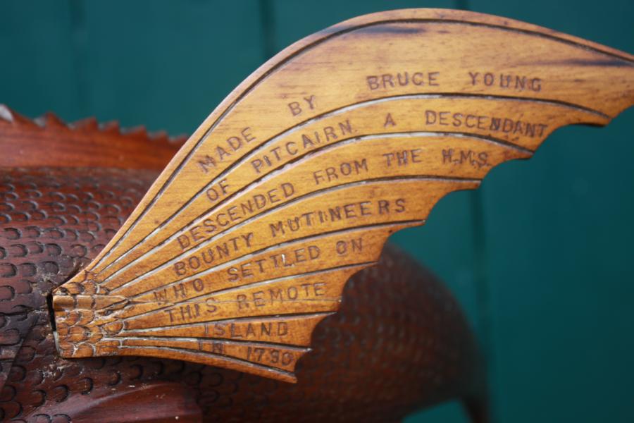 Truly an exceptional beast with a wonderful curving body, fully inscribed wings telling the full story, Signed Bruce Young & dated 1957, only the second fish we have seen dated. 18 1/2 inches long 47 cm and 27 cm high.
