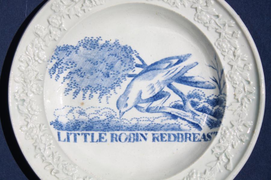 Wonderful small child's plate printed in blue with a titled print LITTLE ROBIN REDBREST.
