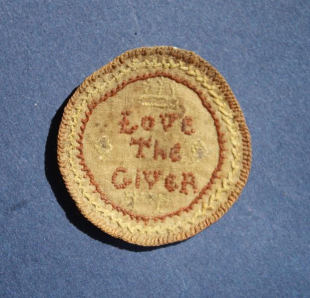 Worked in cream & red silk on a fine silk ground we have the words "LOVE THE GIVER" below a crown and signed TT, with two precious diamonds.