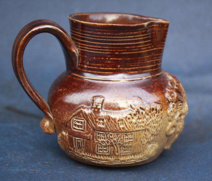 Can a brown saltglaze jug be romantic, I love the combination of a basket of flowers, representing romance leading to the church and a cottage on this small, London Kishere jug of circa 1820.