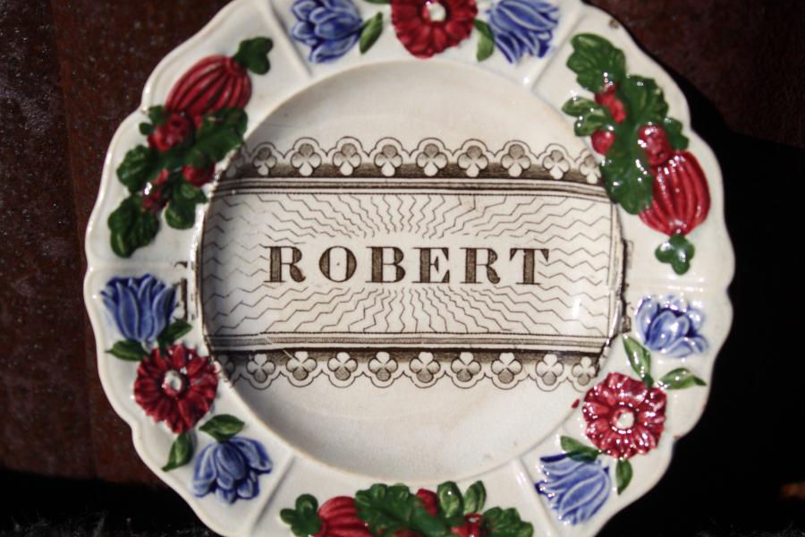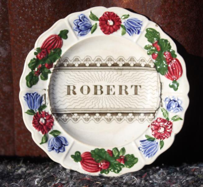 This is a lovely small ( 11cm diameter) creamware child's plate by Rogers of Longport, Stoke On Trent in Staffordshire. It is impressed ROGERS which was the mark used by the factory between 1784 & 1814 although it is believed that it may have been used until 1836. It is moulded with sprigs of flowers picked out in red, green and blue and has a central transfer printed name ROBERT.