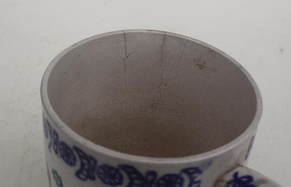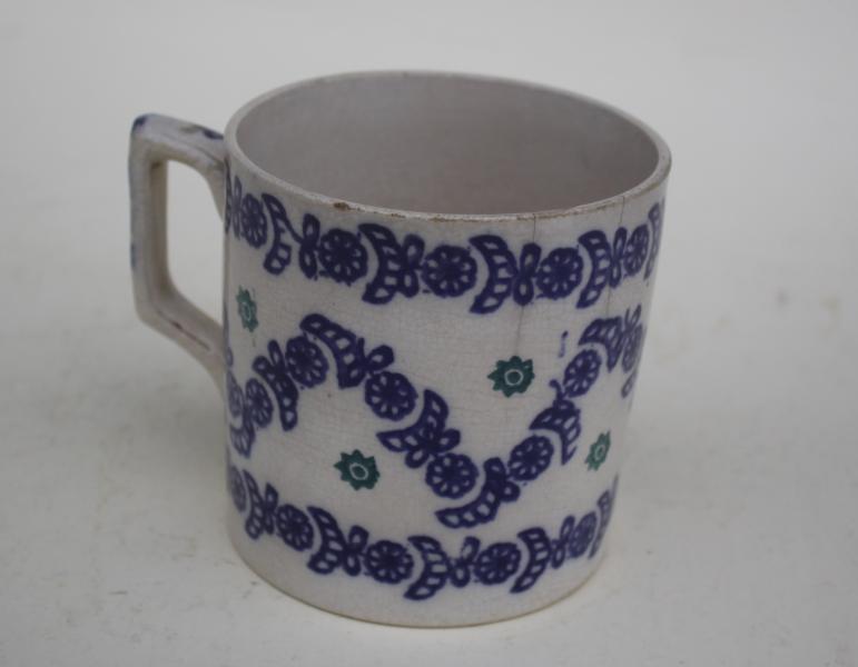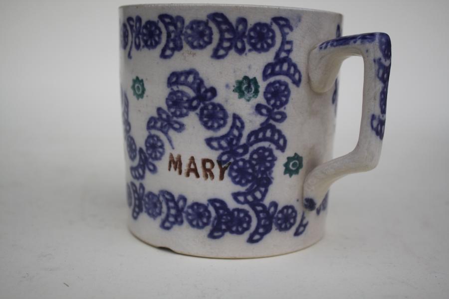 The only "named" spongeware mug we have ever seen. Printed in three colours, blue with green flowers and the name in brown.