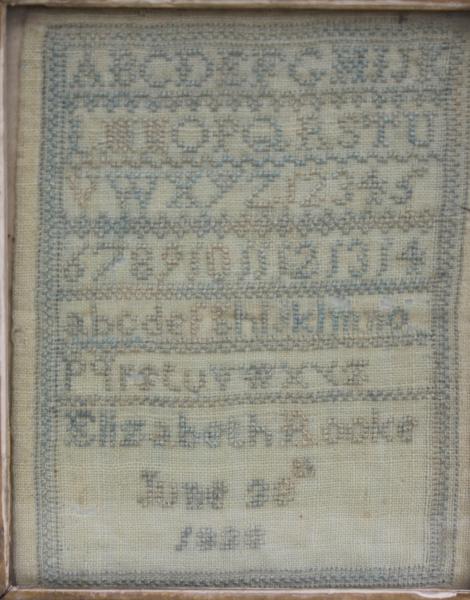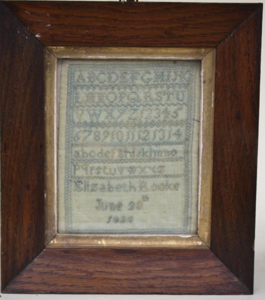 The Alphabet in both upper and lower case letters followed by the sewers name ELIZABETH ROOKE and the date 1823.measuring 16 x 18 cm, the sampler measures only 9 x 11.5.
