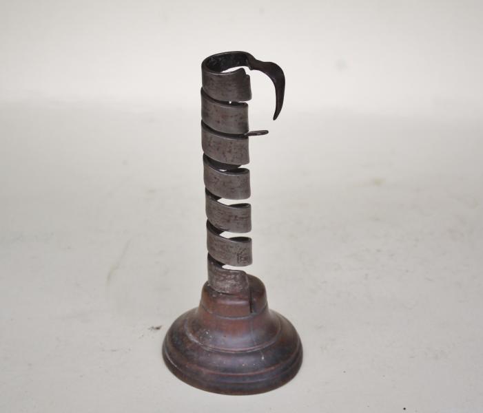 Although many of the books on early lighting have these as English and 18th century, most are in fact French. They were made from the mid 18th century and well into the 19th by the local blacksmith. The wrought iron worked into a spiral in-which they place a raiser that can be worked up as the candle burns down. The base of turned wood. In France they are called Rat Tailed candlesticks, and in the USA they are known as Courting candlesticks, the father of a young woman placing the raiser up to a position, when the candle burns down it is time for the suitor to leave.